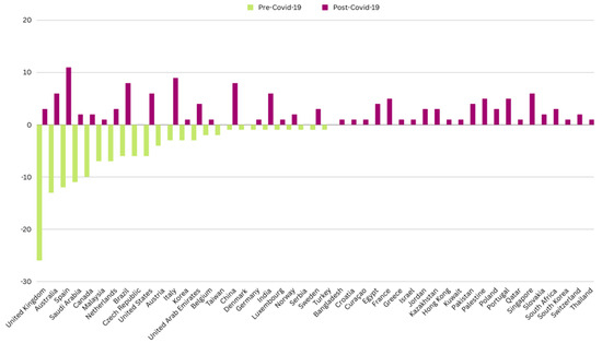 This difference in distribution can also be seen in the bar graphs (Figure 9), where before COVID-19, a more punctual distribution could be seen. The greatest interest in sustainability topics is concentrated on a few nations (green bars pointing downwards), among which the United Kingdom stands out especially, followed by Australia, Spain, Saudi Arabia, and Canada, while post-COVID-19 the interest in the same topics is less confined to a few nations in favour of a wider distribution (red bars pointing upwards), with a growing interest of academics from Asian (from 22.3% to 37.6%) and African (from 0% to 5.3%) nations. These data testify to the scientific community’s commitment to tackling major global challenges, irrespective of which university they come from, whether from a highly developed nation or a small developing state.