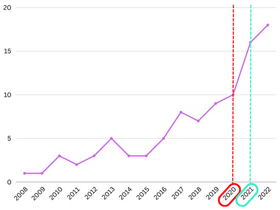 The graph in Figure 10, on the other hand, based on the data obtained by rounding up the 5% of annual publications selected for this research, shows the growing interest in the topics/issues of sustainability and climate change, highlighting how the advent of the pandemic has led to a decisive increase in publications. According to the extrapolated data, almost as many papers were published in the three-year period 2020–2022 as in the entire previous decade.