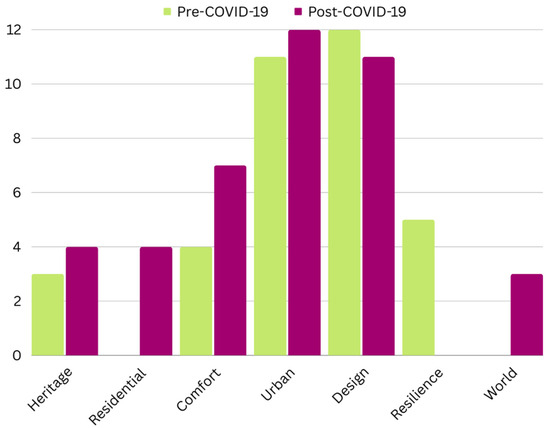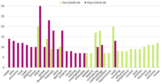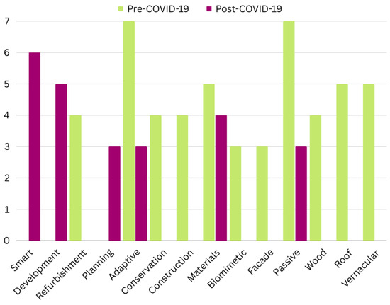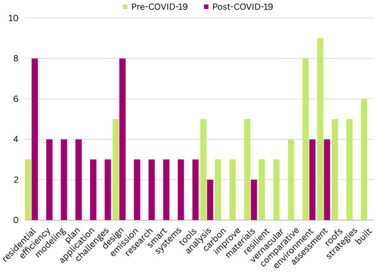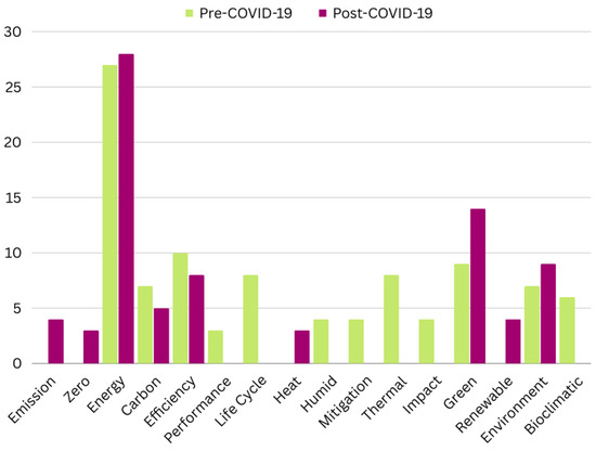 The comparative analysis of the Environmental macro theme (see Figure 11) highlights the constancy and importance of the Energy theme, which continues to be a central pillar of the environmental debate, regardless of external circumstances. In addition, it can be seen that before COVID-19, interest was more focused on technical–scientific aspects (efficiency, performance, humid, bioclimatic), with an interest in the entire life cycle of the building (life cycle), while after the epidemic, the topics most discussed were those concerning clean and renewable energy (zero, emission, renewable, green).