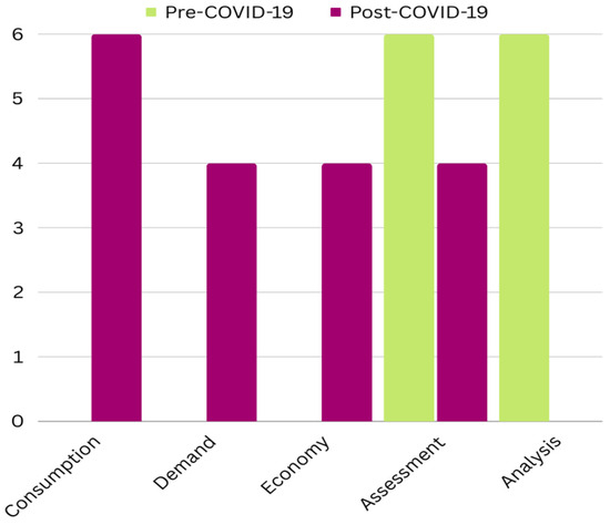 The second comparative analysis concerns the Economic macro theme (see Figure 12). Through this analysis, we can see how the importance that in the past was given to analyses and evaluations (assessment, analysis), which we could say were linked to the technical–scientific aspects we spoke of in the previous comparative analysis, from 2020 passes into the background, joined by purely economic interests (demand, economy) but, above all, replaced by interest, or perhaps more so by concern, for the theme regarding energy consumption (consumption). Thus, a transition can be noted from approaches linked to detailed studies and analyses towards the search for immediate answers triggered by compelling needs and necessities, daughters of the advent of COVID-19.