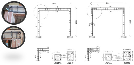 The portal models consisted of columns with dimensions of 150 mm × 150 mm and a total height of 2500 mm. The column used four longitudinal reinforcements with diameters of 10 mm (4D10) and shear reinforcements with diameters of 6 mm at a distance of 200 mm (D6-200). The beams had widths, heights, and total lengths of 150, 200, and 3000 mm, respectively. The beams were reinforced with four longitudinal reinforcements 10 mm in diameter (4D10) and shear reinforcements 6 mm in diameter at a distance of 200 mm (D6-200). For NEB-075 and NEB-100, both sides of the beam–column joints were reinforced with steel plates bonded to the concrete surface using Sikadur 31 CF adhesive. A glue thickness of ±5 mm was applied, and the steel plates were then connected with six fischer bolts with diameters of 8 mm and lengths of 60 mm. Three bolts were installed in the column direction and three beam directions. The bolt installation distance from the edge was 50 mm, and the distance between bolts was 200 mm. Subsequently, the steel plates and concrete were clamped for seven days to ensure that the steel plates were fully attached to the concrete surface with no signs of separation. Figure 2 and Table 2 present the specifications of the RC-frame structure models.