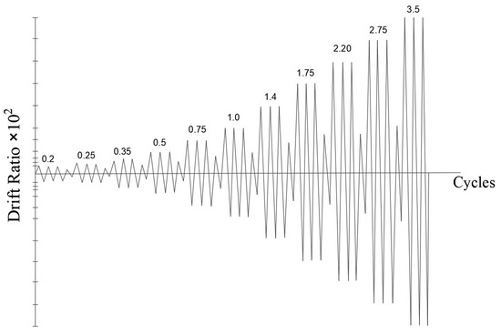 Several researchers have carried out many cyclic and non-cyclic tests with the loading speed and strain response that occurs [23,24,25,26]. The loading protocol for the experiment followed the ACI standard 374.1-05 [27]. The loading cycle, shown in Figure 3, can be explained as follows.