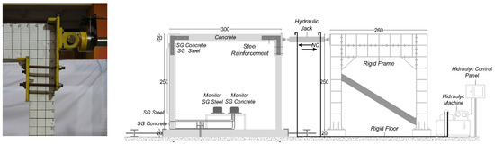 Experimental testing of the structural model was performed via dynamic pseudo-loading. The load was applied using a hydraulic jack (capacity: 250 kN), with a load cell attached to its end. The experimental setup is illustrated in Figure 4.