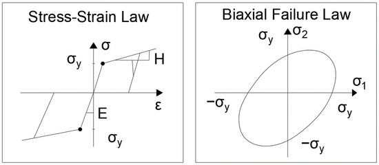The 3D bilinear steel von Mises plasticity model is widely used to simulate the plastic deformation behavior of materials, particularly metals and alloys. This is based on the von Mises yield criterion, which is widely accepted for predicting the onset of plastic deformation in materials. Figure 5 shows the parameters of the model applied to the steel plates.