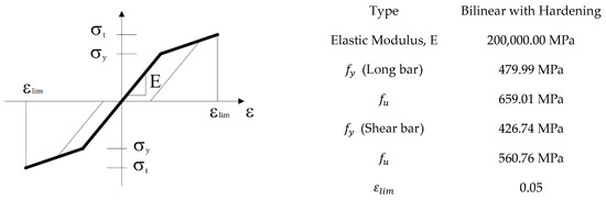 The reinforcement can be discretely modeled as bars and represented by truss elements. The multilinear law, which consists of four lines, is used to model all four stages of steel behavior: elastic state, yield plateau, hardening, and fracture. A multiline is defined by the four points that the input can specify. The software also provides the option of using a simpler constitutive model in the form of a bilinear model with hardening. In this study, the bilinear hardening models of the longitudinal and shear reinforcements are shown in Figure 6.