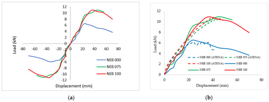 The structural models were tested with pseudo-dynamic loading and displacement envelopes were generated, as illustrated in Figure 7a. The peak loads and their corresponding displacements at each cycle during the compressive and tensile loading were used to create the envelope curves. Figure 7b shows a comparison of the load–displacement curves obtained from the numerical investigation (ATENA) with the experimental test, Figure 7a. In the figure, the load–displacement graphs resulting from the numerical investigation are directly compared with the envelope curves of compressive loading obtained from the experimental investigation. The essential parameters extracted from these curves are the maximum load values and their corresponding displacements. These values are listed in Table 4.