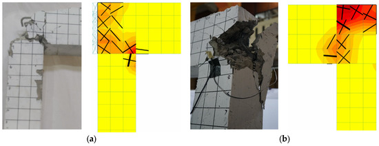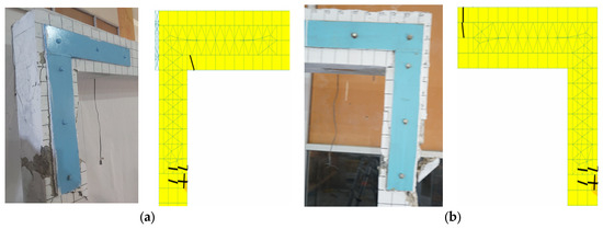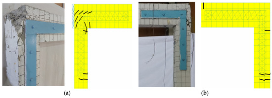 Both the experimental and numerical investigations indicate a concentrated crack pattern at the joints of the NEB-000 model (Figure 8). This confirms that, without strengthening, the joints are fragile; thus, portal collapse originates from severe damage in this region. Hence, under seismic loading, the NEB-000 experienced a complete collapse.