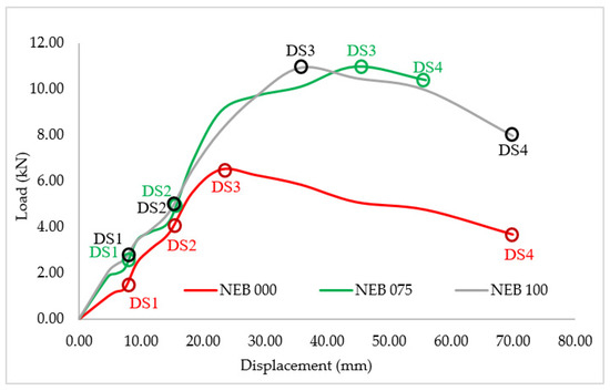 Figure 7 and Table 4 suggest that strengthening the joints of the structural models using steel plates (NEB-075 and NEB-100) can significantly improve the load capacity. The NEB-075 model showed a 68.92% increase in the load capacity (from 6.50 kN to 10.98 kN), while the NEB-100 model experienced a 68.31% increase (from 6.50 kN to 10.95 kN). Although the NEB-100 model exhibited nearly the same increase as that of NEB-075, it exhibited improved ductility. This improved ductility indicates that NEB-100 can better maintain the integrity of the beam and column elements.