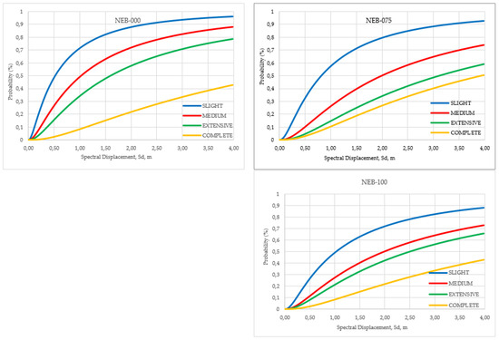 where is the standard normal cumulative distribution function. βds is the standard deviation of the natural logarithm of spectral displacement for the damage state, ds. is the median value of the spectral displacement at which the building reaches the threshold of the damage state, ds. The resulting fragility curves of the NEBs are shown in Figure 13.