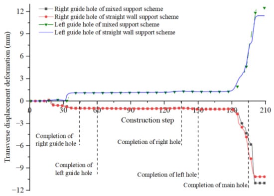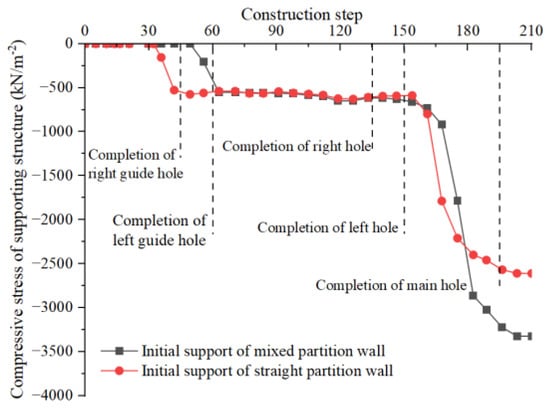 - The middle partition wall was mostly under compressive stress. The mixed-support scheme had stress concentration at the sudden change section, which was the main reason for support structure cracking as well as bearing capacity and the middle partition wall’s integrity deterioration. After optimizing the single straight-wall support form, the partition wall effectively supported the surrounding rock and ensured stability and safety during construction;