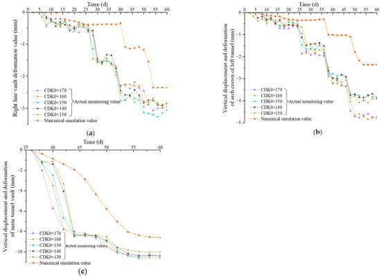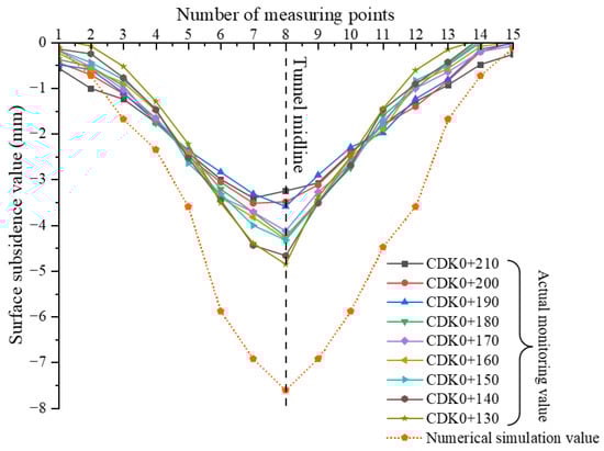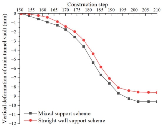 - The peak stratum deformation value under the mixed-support scheme was the largest, which occurred at the main hole’s vault in a variable cross-section position (CDK0+180) with a maximum value of 8.82 mm. After optimizing a single straight-wall support form, the ground settlement at the CDK0+180 section was decreased by 21.15%, which ensured stratum stability;
