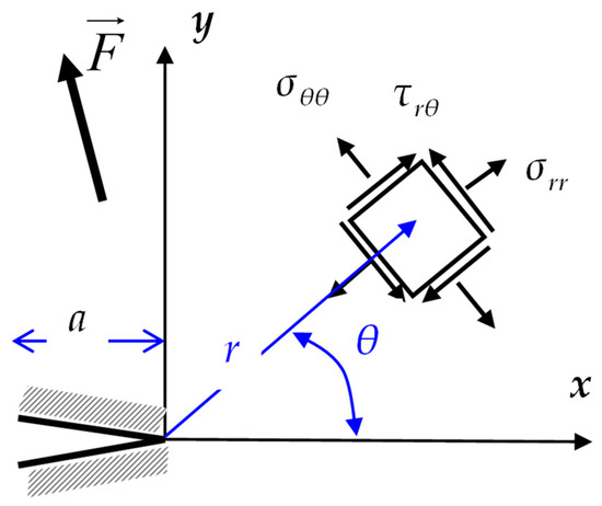 The stress field in a cracked body under an applied force F is schematically represented in Figure 1, where σ and τ are the normal and shear stress, respectively, r and θ are the radial and tangential directions, respectively, and a is the crack length.