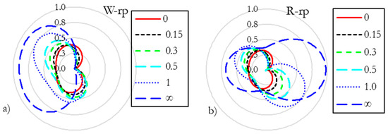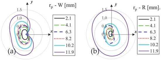 where ΔK is the SIF range, and ΔKth is the fatigue threshold. It is noted how the PZ can give an insight into crack initiation at the shortest radius. Furthermore, an analysis of Equations (4) and (6) gives the angles at which the minimum radius occurs. This is 0° for mode I and 82.5° for pure mode II in the R criterion and 77° in the W criterion. Furthermore, Figure 2 shows how the PZ changes for different mode mixity (KII/KI) ratios for both the W and R criteria, with the latter plotted for plain stress. The PZ is plotted for different mode mixity ratios, from pure mode I, KII/KI = 0, until pure mode II, KII/KI = ∞, but keeping Keq constant, Keq = √(KI2 + KII2) = 1. Both KI and KII were always kept positive. A negative KI does not make physical sense as it requires the crack lips to overlap, whereas a negative KII implies the relative displacements of two opposite-to-crack points. It can be seen how the PZ changes the applied load’s direction.