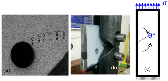 Schematics of the tests. (a) Measured points for the holed CT specimen; (b) testing setup for the holed CT sample; (c) SENT with the inclined crack. (a,b) from [25].