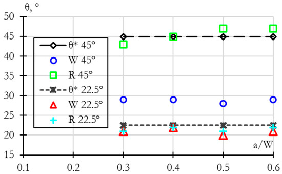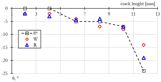 On the other hand, the performance of the CP models for both SENT specimens for dimensionless crack length is shown in Figure 6. The models were evaluated with the retrieved KI and KII. Unlike the C(T) sample, the applied load is monotonic, so there is no need to assume that K is ΔK and Kc is ΔKth. The SENT with a 45° crack showed a KII/KI ratio from 0.46 at the longest to 0.58 for the shortest a/W. Polycarbonate is a material prone to shear-dominated failure, and the 45° crack induces a high KII/KI ratio. Therefore, the W criterion is not expected to perform well under these conditions, so it predicts a quasi-constant 29°, whereas the R criterion predicts a closer CP between 43 and 47°.