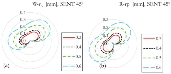 Size and shape of the plastic zone for the SENT sample 45°: (a) from the W criterion, (b) from the R criterion.