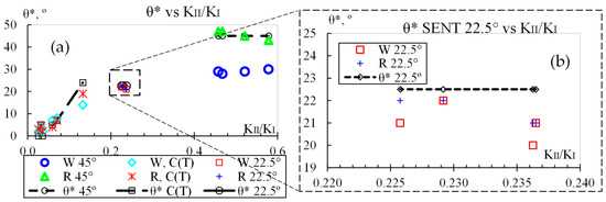 On the other hand, Vormwald et al. [9] argued that the mode mixity ratio [28] might be the parameter that can be used to tell when a crack growth scenario can change from tensile to shear-dominating load. It could make a crack turn when it reaches 0.5. Figure 9 shows the variation in the CP angle with mode mixity for both samples. For the SENT samples, neither the load nor the mode mixity changed much with crack length. For the 22.5° SENT sample, the KII/KI ratio kept a 0.24 constant value, whereas for the 45° sample, the KII/KI ratio went from 0.56 to 0.46, as seen in Figure 6. Vormwald et al. [9] argued that when transitioning from tensile to entirely dominated shear crack growth, such mode mixity parameters might not be able to tell the CP. Therefore, the CP for the SENT samples was not expected to deviate from its initial angle. This can be seen in Figure 9a for the three samples and Figure 9b for a close-up of the SENT 22.5° sample.