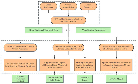 Urban resilience evaluation employs a variety of methods, drawing on diverse disciplines, concepts, and theories. These methods encompass comprehensive index evaluation, resilience network analysis, remote sensing model evaluation, functional modeling, threshold methods, resilience maturity models, scenario analysis, and layer overlay techniques. Among these, the most prevalent is the comprehensive index evaluation. This method utilizes index weights determined by expert scoring [61], the Analytic Hierarchy Process method [44], and the entropy method [45]. In this study, the entropy evaluation method, with the advantage of providing a more objective evaluation, was selected for constructing an urban resilience evaluation model and providing comprehensive scores of urban resilience in the 31 provinces of China based on indices detailed in Table 1. In terms of exploring spatial characteristics, the use of Moran’s index and spatial cold–hot spots can better investigate the agglomeration phenomenon of urban resilience in Chinese provinces and generate a spatial-distribution map. The influence of various factors on urban resilience, as detailed in Table 2, was quantified using a GTWR model. Spatial characterization, based on regression coefficients from the study period, aided in visualizing the results. The research framework and methodology are illustrated in Figure 2.