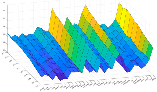 By applying the entropy method to compute the comprehensive scores of urban resilience across China’s 31 provinces, and visualizing these findings using Matlab R2018B, we gain insights into the temporal patterns of urban resilience from 2012 to 2021. As illustrated with the different yellow and blue colors in Figure 3, it can be observed that Chinese provinces exhibit significant differentiation and agglomeration characteristics during research period in terms of their comprehensive scores for urban resilience.