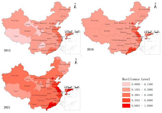 In 2012, Beijing, Shandong, Jiangsu, Zhejiang, Shanghai, and Guangdong achieved a middle resilience level, while Tibet, Gansu, and Guizhou reached an upper-middle resilience level. However, the majority of the provinces in China exhibited lower-middle levels of resilience. This pattern indicates that, at this stage, spatial differentiation in urban resilience across the provinces was not markedly pronounced.