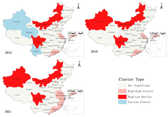 In 2012, China’s urban resilience was primarily characterized by the low–low agglomeration type, encompassing provinces such as Xinjiang, Qinghai, and Yunnan, all exhibiting low levels of urban resilience. Conversely, the high–high agglomeration regions, comprising Beijing, Tianjin, Jiangsu, Shanghai, and Guangdong provinces, demonstrated elevated urban resilience levels both within these provinces and their adjacent regions. The occurrence of high–low agglomeration regions was less frequent, with only Sichuan and Inner Mongolia falling into this category. Notably, Sichuan displayed a relatively high urban resilience level but with lower levels observed in its surrounding provinces. Consequently, the prevailing trend in 2012 was the dominance of low resilience levels across China’s urban resilience landscape.