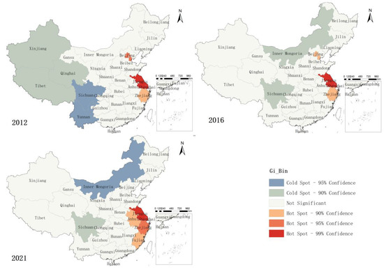 Hot-spot analysis using Getis-Ord Gi* in ArcGIS software was employed to calculate hot and cold spots of comprehensive urban resilience scores for the 31 provinces in China for the years 2012, 2016, and 2021. The natural breaks method was applied for visual analysis (see Figure 6). Notably, the southeastern coastal provinces consistently emerged in hot-spot and sub-hot-spot regions. In contrast, over the study period, Inner Mongolia and Sichuan provinces gradually transitioned into cold-spot and sub-cold-spot regions. The spatial distribution of hot and cold spots in urban resilience across the 31 provinces reveals a “persistent hot” phenomenon, with cold-spot areas exhibiting more scattered patterns and displaying a certain degree of randomness.