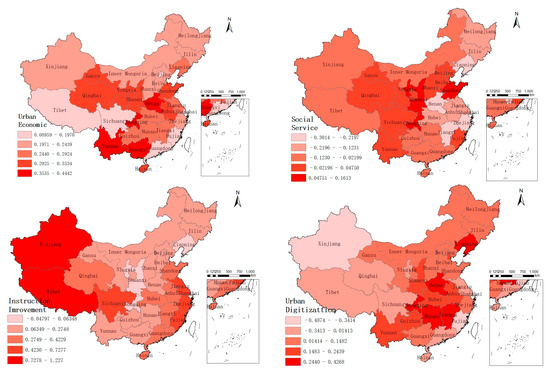 - Urban science and education. Regions with high values are mainly concentrated in southern coastal provinces. The progress of science and technology in these areas supports the development of modern information network cities. In the event of disturbances or impacts on these cities, a robust information network can efficiently establish a post-disaster reconstruction and repair system. In contrast, regions with negative values are predominantly found in central areas with comparatively weak government investment in science and technology. As a result, these regions lack the capacity to leverage advanced modern urban systems for constructing resilience networks in urban development.