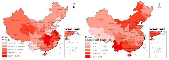 - Urban science and education. It is apparent that the majority of provinces in China fall into the negative value category. Moreover, the level of science and education stands out as the most significant influencing factor among the six factors affecting urban resilience, ranging from a maximum value of 1.923984 to a minimum value of −6.925434. This underscores the considerable impact of science and education levels on urban resilience, revealing noteworthy disparities across diverse regions.