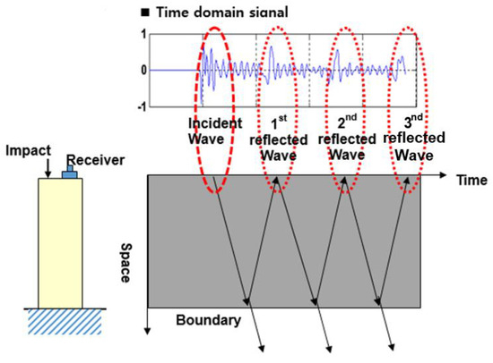 Piles are installed in the soil with the pile head being the only accessible point for non-destructive tests. A vertical impact on the pile head primarily generates a P-wave that propagates along the pile and is then reflected at the bottom of the pile. A traveling P-wave in the pile forms a guided wave showing a dispersive characteristic [21,26]. The measured signal on the pile head consists of the incident wave and a series of reflected waves, as shown in Figure 2.