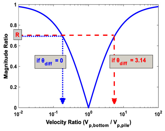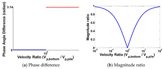 where Er and Ei are the energies (or magnitudes) of the reflected and incident waves, respectively. Vp,pile and Vp,bottom represent the phase velocities of the P-wave in the pile and the material under the pile bottom, respectively. R varies with the P-wave velocity ratio (Vp,bottom/Vp,pile) between the two materials, as shown in Figure 3b. In this figure, each magnitude ratio (Er/Ei) corresponds to two different velocity ratios at the same time. One is for the stiffer boundary range, and the other is for the softer boundary range. This means that it is impossible to determine the boundary condition under the pile from only the magnitude ratio.
