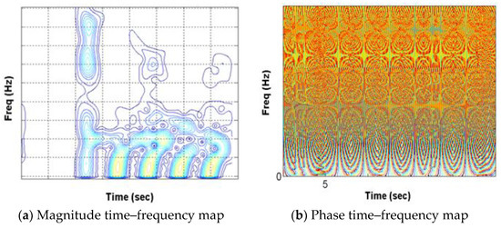 By comparing Equations (2) and (6), the magnitude and phase of are shown to be representative of the magnitude and phase of a single-frequency amplitude-modulated (AM) signal , as defined in Equation (2), versus time. Using the harmonic wavelet transform, the magnitude and phase time–frequency maps are determined and are shown in Figure 4. These time–frequency maps represent a time variation in the magnitude and phase angle for every frequency component with time. And, the magnitude and phase variations over time of a single-frequency signal component can be evaluated from these magnitude and phase time–frequency maps.