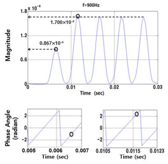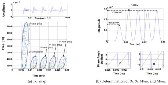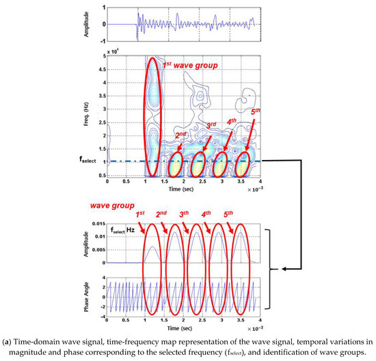 Generally, it is difficult to clearly define or evaluate the instantaneous magnitude and phase corresponding to each wave group in the time domain wave signal generated by the impact because the measured wave signal is a multi-component signal. It consists of various independent frequency components, each with its own magnitude and phase [38], and has dispersive characteristics that can cause distortions in the shape of the wave group over time in the time domain signal [39]. However, for the single-frequency component, the instantaneous magnitude and phase can be clearly defined [38,39]. The single-frequency component can be defined as an amplitude-modulated (AM) signal and is given as follows: