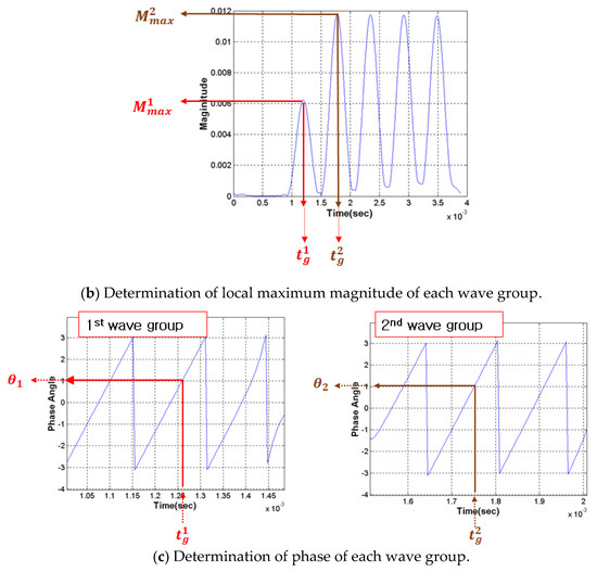 - Determine the phases θ1, θ2, θ3, … from the phase of the harmonic wavelet coefficient corresponding to fselect. These phases correspond to tg1, tg2, tg3, … (Figure 5c). Evaluate the phase difference θdiff between the consecutive wave groups.