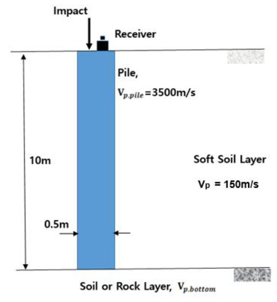 To demonstrate the feasibility of the proposed method for evaluating the wave velocity (i.e., stiffness) of the material under a pile installed in a soft soil layer, numerical simulations were performed using the ABAQUS computer program with axisymmetric modeling. The element size is 0.01 m and the sampling rate is 4 , both meeting the necessary conditions for stable numerical wave propagation analysis [41,42,43]. The numerical simulation model comprises a pile, the laterally surrounding soft soil layer, and the material (i.e., soil or rock) layer under the bottom of the pile, as shown in Figure 7. The diameter and length of the pile are 0.5 m and 10 m, respectively. The P-wave velocity of the pile is 3500 m/s, and the damping ratio is 0.5%. A P-wave velocity of 150 m/s is used to simulate the surrounding soft soil [44]. The P-wave velocities of the soil or rock under the pile bottom are as follows: free boundary condition (0 m/s), 600 m/s, 1500 m/s, 2200 m/s, 4000 m/s, 6000 m/s, and fixed boundary condition (∞ m/s). The Poisson’s ratios of the pile and soil (or rock) are 0.2 and 0.25, respectively. The unit weights of the pile, surrounding soft soil, and bottom soil (or rock) are 2200, 1800, and 1950 kg/m3, respectively. These material properties are presented in Table 1. In this numerical test, an impact load is applied to the pile head, and the acceleration of vibration of the pile head surface is measured.