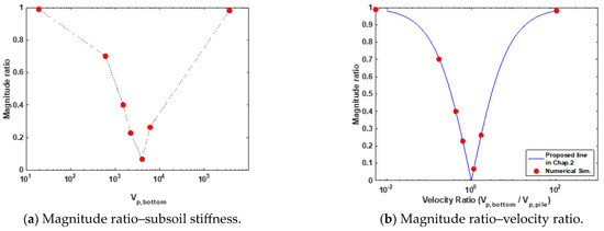Figure 12b compares the numerical simulation results with the magnitude ratio plot in Figure 3b, which represents the magnitude ratio according to the pile-to-subsoil stiffness ratio (velocity ratio) in Section 2. The two results in this figure are well matched, indicating that the magnitude characteristics depicted in Figure 3b based on the velocity ratio effectively reflect the signal’s magnitude behavior induced by waves propagating within the pile.