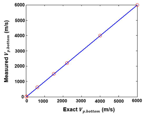 Figure 10a–e shows the magnitude and phase of the harmonic wavelet coefficients corresponding to 900 Hz for the intermediate boundary condition case. θ1, θ2, M1max, and M2max for each case are depicted in these figures (indicated by black circles). In the cases of Vp,bottom values of 600, 1500, and 2200 m/s (as shown in Figure 10a–c), the phase differences are determined to be zero and the magnitude ratios are calculated to be 0.701, 0.400, and 0.228, respectively. is evaluated to be 0.175, 0.429, and 0.629, respectively, using the phase difference, the magnitude ratio, and Figure 3 or Figure 6. Vp,bottom is calculated to be 615, 1500, and 2200 m/s, respectively, using Equation (10) and . In the cases of a Vp,bottom value of 4000 and 6000 m/s (as shown in Figure 10d,e), the phase differences are determined to be 3.14 for both cases and the magnitude ratios are calculated to be 0.067 and 0.263, respectively. is evaluated to be 1.144 and 1.714, respectively, using the phase difference, the magnitude ratio, and Figure 3 or Figure 6. Vp,bottom is calculated to be 4003 and 5990 m/s, respectively, using Equation (10) and .