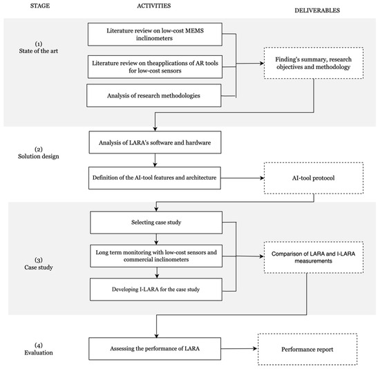 The remainder of this paper is structured as follows: Section 2 presents the research methodology followed in this work. Section 3 presents a detailed analysis of the main characteristics of the low-cost monitoring system LARA, including both its software and hardware. In Section 4, the AI tool developed to enhance the accuracy of the rotations acquired by LARA is detailed. In Section 5, the practical application of these tools to the case study is summarized. Finally, the main conclusions are drawn in Section 6.