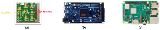 LARA sensor and data acquisition equipment: (a) LARA PCB; (b) Arduino Due; (c) Raspberry Pi.