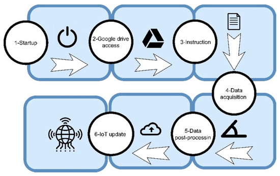 This subsection outlines the automated software procedures of LARA. This monitoring solution is designed as a user-friendly IoT-based sensor, simplifying the setup process. Once the sensor is installed on a structure, it only requires connection to a 5 V, 2.5 A battery or a power source through the Raspberry Pi adapter. Upon powering up, LARA commences data acquisition and transmits the collected data to a designated Google Drive account.