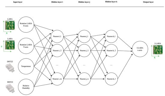 - Output layer: The output layer comprises a single neuron that yields accuracy-enhanced measurements of LARA’s inclinations along the X-axis, named Intelligent (I)-LARA. This neuron undergoes supervised training using data from precise commercial sensors.