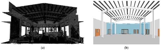 The monitored case study corresponds with a steel gable frame. This structural element is located at the building of the Institute of Technology of the University of Castilla-La Mancha (UCLM) in the city of Cuenca, Spain. It consists of HEB 300 for the columns (6 m high) and IPE 400 for the beams (11.5 m long). The cloud points of this structure are presented in Figure 5a. This dataset served as the basis for creating the Building Information Model (BIM) of the steel gable frame depicted in Figure 5b. The creation of this model was carried out within Revit, aided by Autodesk ReCap software (Autodesk ReCap Pro 2024), achieving a Level of Development (LOD) of 300. The roof’s live loads are limited to sporadic maintenance tasks. It is crucial to emphasize that no maintenance activities were undertaken during the monitoring period, and the structural response of this structure was primarily driven by environmental parameters, such as temperature and humidity changes.