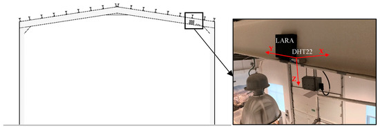 The alternative monitoring implemented within this structure included the following two low-cost sensors: (1) LARA, employed to measure rotations across three axes (X, Y, and Z), and (2) DHT22, used to record environmental temperature and humidity data. These sensors were positioned at the same location as the commercial inclinometer. Figure 6 provides a visual representation of the low-cost sensors’ installation on-site, highlighting LARA’s rotational axes. It is important to highlight that the LARA’s X-axis rotations corresponded with those measured by the commercial inclinometer. The monitoring system included one Arduino Uno Board and one 4GB Raspberry Pi. This device might be used to control up to four LARAs.
