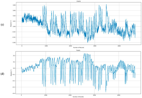 Dataset obtained by low-cost monitoring system: (a) DHT22 temperature; (b) DHT22 humidity; (c) LARA X-axis’; (d) LARA Y-axis’ rotations.