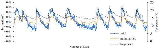 Figure 8 presents a comparison of the inclinations obtained by LARA and the commercial accelerometer from 12 to 22 February 2023. This figure also includes the temperatures measured by the DHT22 sensor. The analysis of Figure 8 illustrates the considerable impact of temperature fluctuations on the monitored rotations. For instance, the rotations of the EL-Tiltmeter SC on 22 February shifted from 0.019° to −0.002° as the ambient temperature decreased from 21.1 °C to 12.2 °C. Although both sensors demonstrate similar trends in capturing the influence of temperature over time, LARA’s results present higher variations.
