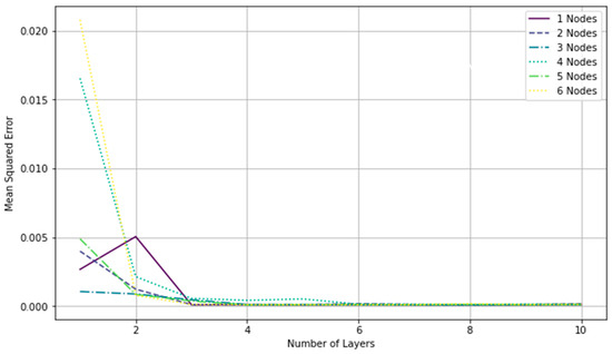 The network performance for various architectures is presented in Figure 9, which includes the Mean Squared Error (MSE) values obtained from the cross-validation dataset for different numbers of hidden layers (ranging from 1 to 10) and neurons (ranging from 1 to 6).