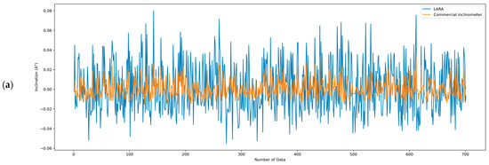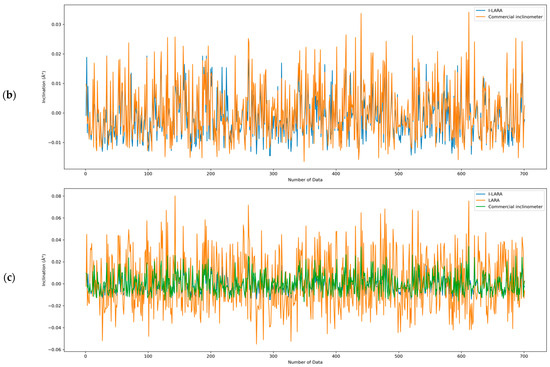 Comparison between: (a) LARA and the commercial inclinometer; (b) I-LARA and the commercial inclinometer; (c) LARA, I-LARA, and the commercial inclinometer.
