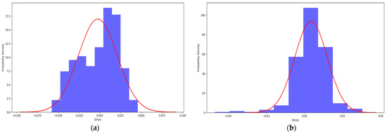 Probability density error with fitted normal distribution between: (a) LARA and EL Tiltmeter SC; (b) I-LARA and EL Tiltmeter SC.