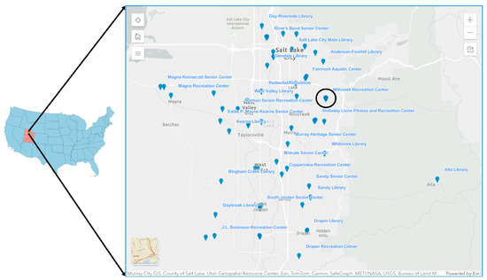 The Millcreek Library center study site (inset within the black circle) shown within Salt Lake County, Utah, USA. The blue markers represent all sites serving as Cool Zones in Salt Lake County. Map obtained from the Salt Lake County Aging and Adult Services Cool Zone Program website [24].