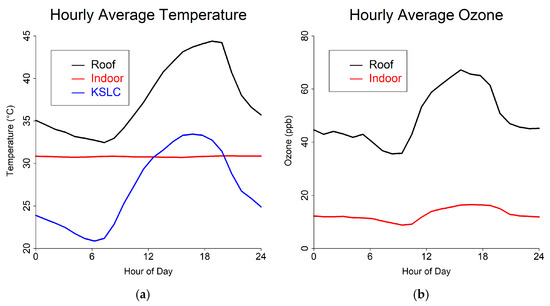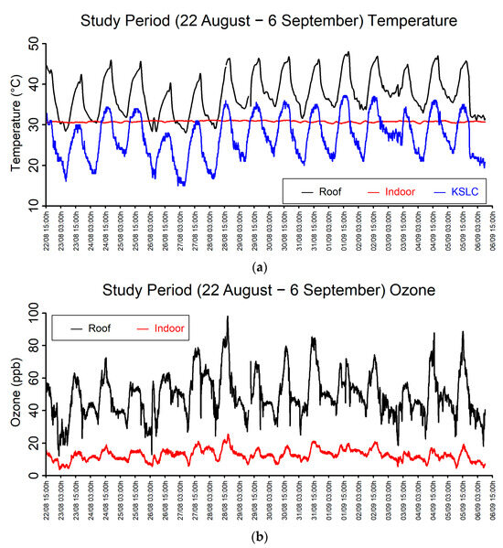 Diurnal (a) temperature and (b) ozone concentration time series. The black line denotes the outdoor “Roof” value, and the red line represents the indoor value. The blue line represents the Salt Lake City airport “KSLC” readings.