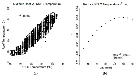 Roof and KSLC temperature comparisons: (a) during the study period at lag 0 and (b) r2 values obtained by lagging the Roof readings to the KSLC data.